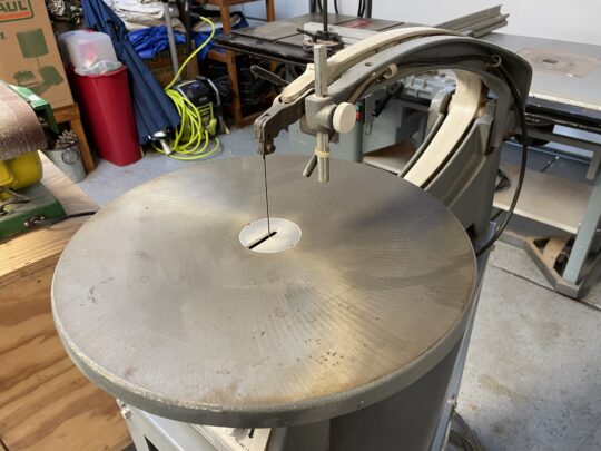 A scroll saw has a short, reciprocating blade. It can cut curves, including very small radius turns with small enough blades. It has a broad round table to support your work in all orientations. The blade can be easily removed, which allows you to cut on the inside of a closed shape, such as the inside of a circle.